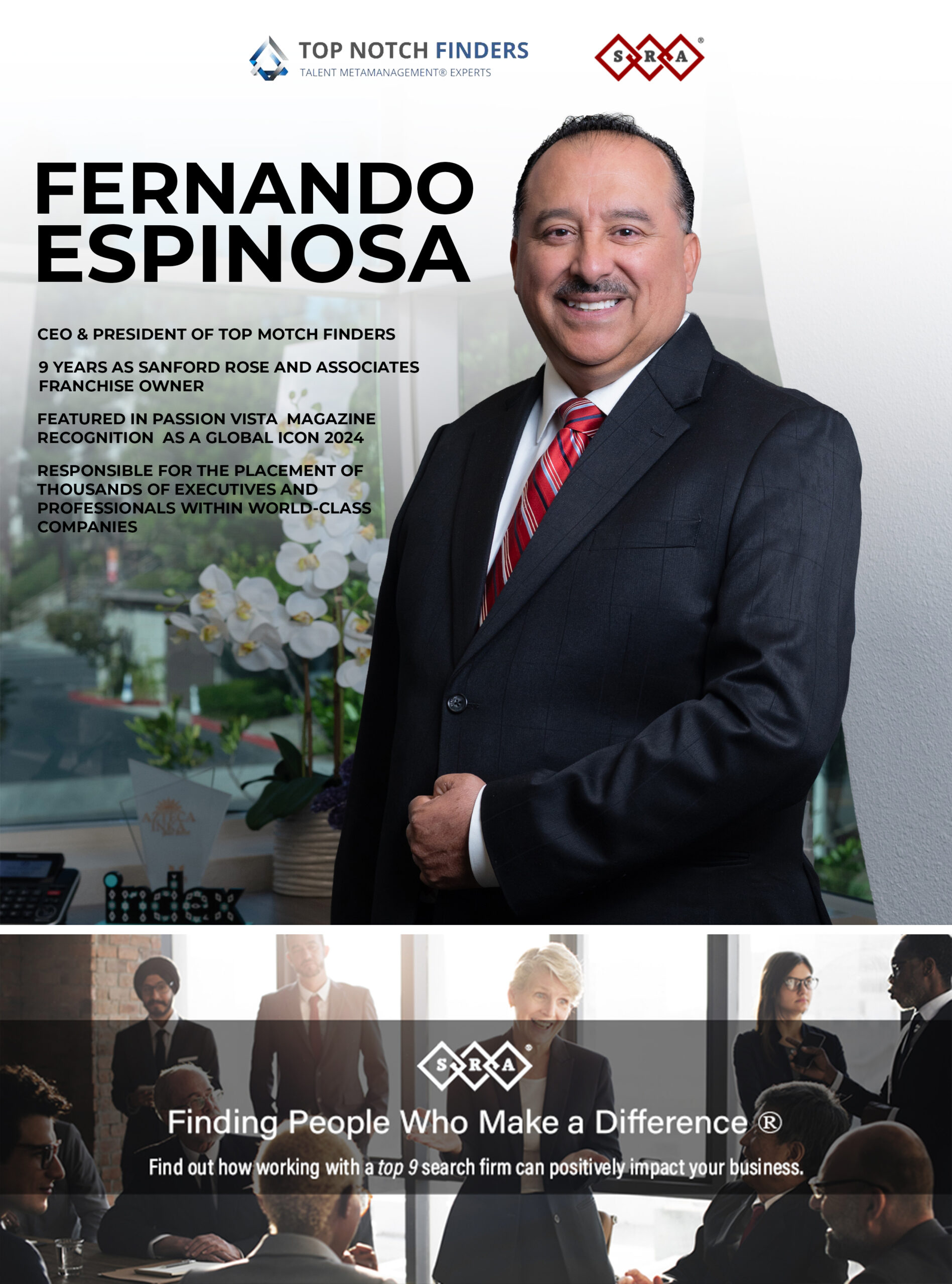 Además de su liderazgo personal, Fernando Espinosa ha construido una empresa sólida en el área de San Diego, California, especializada en brindar servicios estratégicos de consultoría, gestión de talento y desarrollo empresarial. Su firma se distingue por acompañar a corporativos y directivos en la toma de decisiones críticas, desde la selección de ejecutivos de alto nivel hasta el diseño de estrategias de crecimiento sostenido.